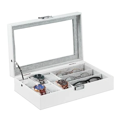 Jewellery organiser: Practical jewellery storage for clear storage of jewellery, glasses and more Design: Elegant jewellery box in white leather look - Eye-catcher on make-up and dressing table Protection: The jewellery box is lined with a soft inner cover - Provides protection from scratches Storage: Jewellery holder with 6 watch cushions - 3 large sections for glasses, necklaces, bracelets Details: Elegant jewellery case with metal lock and viewing window - HxWxD: approx. 9 x 33 x 20.5 cm
