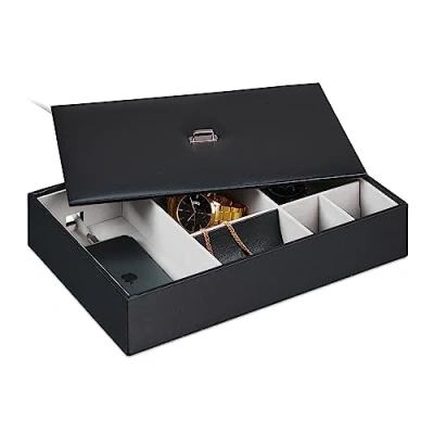 Jewellery organiser: Practical jewellery box for clear storage of jewellery, watches and much more Design: Jewellery holder in leather look - Eye-catcher on make-up and dressing table - In black Protection: The jewellery box is lined with a soft inner cover - Provides protection from scratches Charging station: Thread the charger through the holes in the side to charge Smartwatch or phone Details: Elegant jewellery storage with lid and practical dividers - HxWxD: approx. 7 x 32 x 22 cm