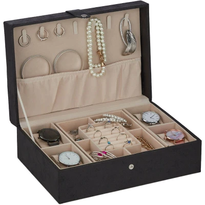 Relaxdays Jewellery Organiser with Lid, Leather Look, Velvet, Jewelry Box for Ladies & Gents, HWD: 10x29x20 cm, Black, Fibreboard