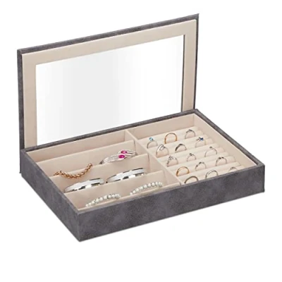 Relaxdays Jewellery Organiser with Lid, Leather Look, Velvet, Jewelry Box for Ladies & Gents, HWD: 5 x 30 21 cm, Grey, Fibreboard