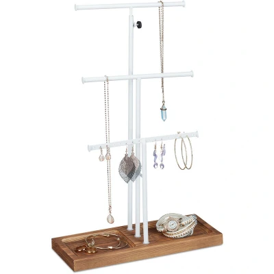 Relaxdays Jewellery Stand, 3 Bars, T shaped, Shelf, H x W D: 61.5 28 10.5 cm, Wood & Metal, White/Brown