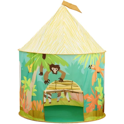 Amazon MarketplaceFun for little explorers: Jungle-themed children's tent – Roll-up entrance – HxD approx. 125 x 95 cm Simple: the play tent sets up in just minutes and folds away to save space when not in use For indoors: Perfect as a children's tent or play den – offers a snug retreat for kids Ideal outdoors: Lightweight fibreglass-pole tent – perfect garden shelter in fine weather Colourful: Vibrant jungle tent with flag – design of a hut with monkeys, palm trees, and a parrot.