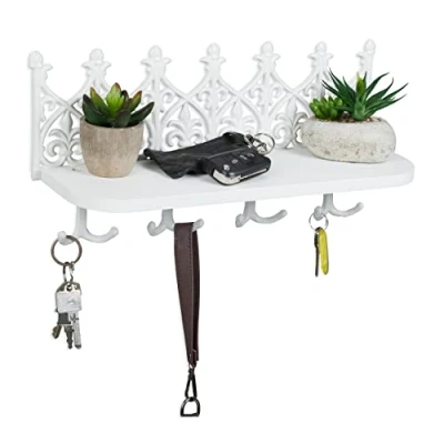Relaxdays Key Board with Shelf, Wall Holder 8 Hooks, Cast Iron, Vintage Hallway Decor, White, 100%, 19.5 x 39.5 12 cm