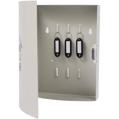 AmazonOrganiser: Key cabinet with a stylish, curved door front – hooks accommodate 9 keys Decorative: Key cabinet with Home Sweet Home lettering - Dimensions H x W x D: 24 x 21 x 6.5 cm With door: Front with practical magnetic closure - Key storage for neat and organised storage Sturdy: Key box made from robust iron with holes for wall mounting – includes screws and plugs. Use: Key box for office, garage, workshop or home – keys always within reach