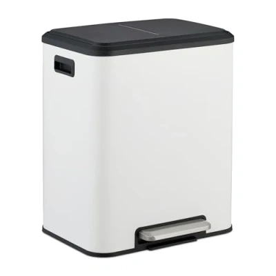 AmazonPractical: Dustbin with 2x15 litre capacity – ideal for waste separation in the kitchen or office Design: Sleek square kitchen bin in white – the ideal waste system for contemporary spaces Soft close: Waste separation system with soft-close lid for gentle and silent closure Hygienic: Removable inner plastic buckets with handles – Makes emptying the dustbins easy Hands-free: Pedal operated bin for easy lid opening and closing without using your hands