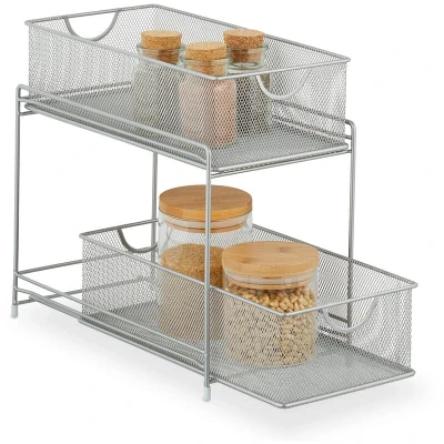 AmazonOrder: Shelf organiser creates more order in kitchen and bathroom cupboards - With pull-out baskets Design: Kitchen cupboard organiser with 2 pull-out baskets in modern mesh design - In silver colour Practical: Thanks to its slim design, the cleaning product organiser fits ideally in every cabinet Versatile: Bathroom organiser is ideal for storing spices, cleaning products, bathroom items, etc. Details: Modern sink cabinet organiser with drawers made of steel - Dimensions HWD: 32 x 19 x 35.5cm