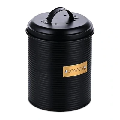 For the kitchen: Compact compost bin for collecting organic waste – for food scraps, eggshells, etc. Odour-proof: Compost bin with activated charcoal filter in the lid – protects against odours. Decorative: Round compost bin in matte black – stylish retro design with 'Compost' label Hygienic: Bio waste bin with removable lid – easy to empty and clean Details: Steel waste bin with ventilation holes - HxD: 21.5 x 14 cm - Volume: 2.5 litres