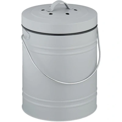 AmazonKitchen: Grey compost bin with lid for collecting food waste, like vegetable scraps and eggshells Hygienic: Iron compost bin with odour filter – easily wipeable and prevents unpleasant smells Ready to use: Waste bin with 2 charcoal filters – ideal for the kitchen, balcony, caravan and more Stylish: Compost bin in a sleek, matte design – handle and lid grip – lightweight and easy to clean Basics: Round waste caddy with inner bucket - HWD: approx. 30 x 22.5 x 20.5 cm - Capacity: 5 litres