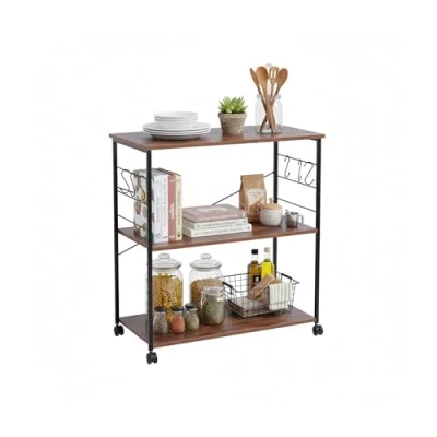 This versatile kitchen trolley offers ample space for utensils, supplies or appliances across three generous tiers. With four castors it can be moved easily between rooms. Six handy S‑hooks keep tea towels, oven gloves and accessories within reach, while the open design allows quick access. Whether used as a sturdy microwave shelf in the kitchen or a mobile book trolley in the living room, it combines function and style. Kitchen trolley in detail - Dimensions H x W x D: approx. 87 x 80 x 40 cm - Upper shelf load capacity: approx. 30 kg - Lower shelf load capacity: approx. 20 kg each - Weight: approx. 11.2 kg - Material: iron, MDF - Colour: brown, black Kitchen trolley with castors - Large serving trolley for microwave, crockery and more - 3 sturdy shelves in an attractive wood effect - Trolley with 4 swivel castors, 2 with brakes - Includes 6 S‑hooks for hanging pot holders, tea towels etc. - Sturdy utility trolley of robust MDF and durable iron - Versatile rolling trolley for