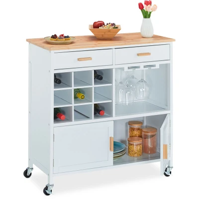 Relaxdays Kitchen Trolley, HxWxD: 88.5 x 86 41 cm, Worktop, Wine Rack, Glass Holder, Wheeled Culinary Cabinet, White, Engineered Wood