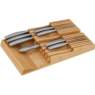 Relaxdays Knife Holder Drawer for 9 Knives and Sharpening Steel, Bamboo Block Lying Down H x W D: 5.5 13 40 cm, Natural