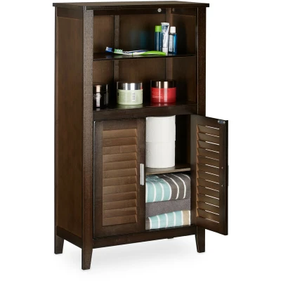 General description This Relaxdays LAMELL Dark Brown Bathroom Cabinet combines natural beauty with functionality, making it a perfect addition to any bathroom. Crafted entirely from robust bamboo, this cabinet is designed for damp or moist environments, ensuring durability and longevity. The slat doors promote optimal air circulation, keeping your items fresh and dry. With two shelves and compartments, it offers ample storage space for all your cleaning and bathroom supplies, and it can also serve as a stylish telephone table in your hallway. Technical specifications Dimensions: HxWxD: 92 x 50 x 25.5 cm Weight: approximately 8.7 kg Capacity of top shelf: approximately 50 kg Capacity of interior shelves: approximately 15 kg Material: 100% Bamboo Other information Included in delivery: Bathroom cabinet in pieces, instructions, assembly materials Decorative items shown in product photos are not included