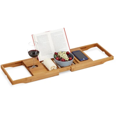 Relaxdays Large Bamboo Bath Tray, Book & Tablet Holder, Glass Support, Luxury, Light, Extendable 70 105 cm, Natural
