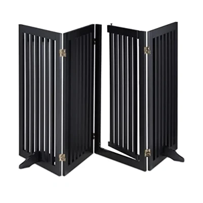 AmazonSafety: Black stairs-, doors- and fire barrier to protect dogs and children in home approx. 92 cm Flexible: 4-part protective barrier can be set up in various positions - Max. width: approx. 206 cm Versatile: Sturdy safety fence for children and pets can be put anywhere - With practical door Compact: If not in use, you can simply stow the safety gate away thanks to its folding function Basics: Free-standing stair gate made of firm MDF - Includes 2 stable feet with floor protectors