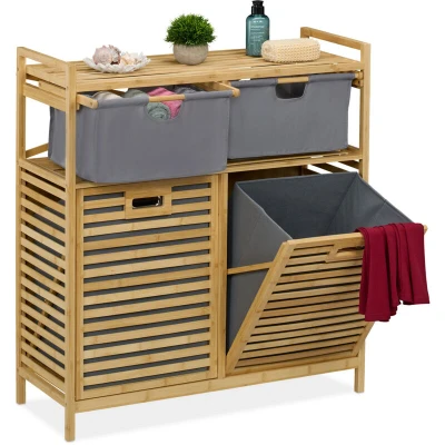 Relaxdays Laundry Basket Rack, 2 Fabric Hampers, 40 l Each, Drawers, Bamboo, Washing Sorter, 95x88x33 cm, Natural/Grey