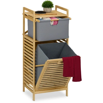 General description The Relaxdays Laundry Basket is a practical and stylish solution for small bathrooms. This innovative design combines a laundry hamper with a shelf, allowing you to store towels, detergent, and decorative items while keeping your dirty laundry discreetly hidden. The bamboo construction adds a natural touch to your space. Technical specifications Dimensions (H x W x D): approx. 95 x 40 x 33 cm Weight: approx. 6.2 kg Material: Bamboo, polyester Colour: Natural, grey Shelf dimensions (W x D): approx. 37 x 33 cm Shelf load capacity: max. 10 kg Laundry bag volume: approx. 30 litres Load capacity of laundry bag: max. 5 kg Internal drawer dimensions (H x W x D): approx. 14.5 x 32.5 x 30 cm Usage Simply toss your dirty laundry into the tiltable laundry hamper and close it for a neat appearance. Utilize the shelf for storing towels, detergent, or decorative items. The fabric drawer provides additional storage space for bathroom essentials.