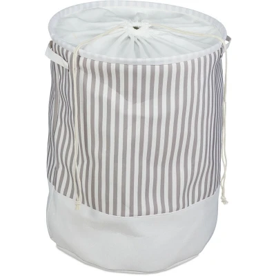 The laundry basket is a practical and decorative accessory for your home. The laundry bag offers plenty of space for your dirty laundry, which is stored discreetly until the next wash thanks to the drawstring. With the help of the handles, the laundry bin can be easily carried to the washing machine. When not in use, the laundry box can be folded and stowed away to save space. The decorative striped pattern makes the laundry bag an eye-catcher in the bathroom, children's room or bedroom. Laundry basket in detail - Measures H x D: approx. 56 x 42.5 cm - Volume: approx. 60 l - Weight: approx. 0.6 kg - Material: Polyester, cotton, steel - Colour: White, grey Foldable Laundry Bag with Drawstring - Laundry bin for collecting your laundry in an organised and tidy way - With drawstring to close - laundry box remains hidden from view - Easy to transport to the washing machine with carrying handles - Decorative design with striped pattern in grey and white - When needed, fold up and store in a