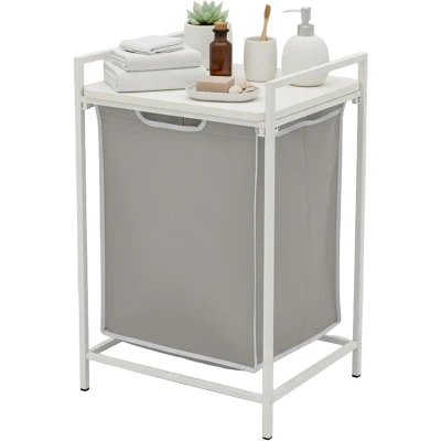 Store your dirty laundry discreetly until the next wash. The laundry basket with removable fabric bag also provides a sturdy shelf for detergent, towels or cosmetics. With its robust metal frame and washable fabric bag, this laundry unit impresses with durability and functionality. A practical organiser for bathroom, bedroom or laundry room. Laundry basket shelf in detail - Overall dimensions H x W x D: approx. 72 x 50 x 33 cm - Capacity: approx. 65 l - Shelf load capacity: approx. 20 kg - Material: polyester, iron, MDF - Available in various colours Practical laundry unit with metal frame - Space-saving combination of shelf and laundry storage - Fixed top shelf for bathroom items, towels or detergent - Laundry basket with reinforced base and 2 carrying handles for secure transport - Removable laundry bag with hook-and-loop fastener is washable - Ideal for discreet storage of dirty laundry in bathroom or bedroom Included in delivery - 1x laundry basket shelf in parts - Includes
