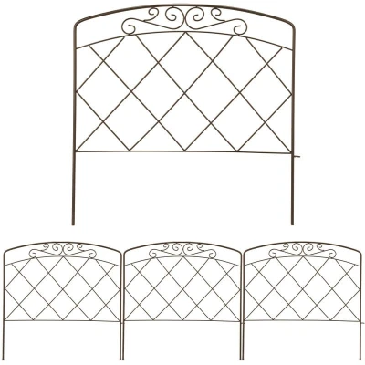 General description Design and embellish your garden quickly and easily with this decorative bed edging. Mark the transitions between beds, green areas, paths, and borders with the low decorative fence. The beautiful vintage-look decorations make this plug-in fence an eye-catcher in your garden. Technical specifications Dimensions per fence element: H x W x D: approx. 60 x 62.5 x 2 cm Total length: approx. 248 cm Visible height: approx. 41.5 cm Weight per fence element: approx. 1.3 kg Material: Steel Colour: Bronze Installation The 4 fence elements are simply inserted into the ground using the ground spikes. Conveniently insert the fence into the ground for easy setup. Usage Ideal for creating clear boundaries in the garden. Flexible arrangement of the bed border as required.