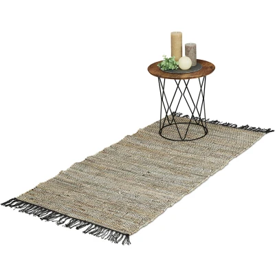 Relaxdays Leather & Cotton Runner Rug, with Fringes, Non Slip, for Livingroom, Bedroom or Hallway, 70 x 140 cm, Grey, Real, 70x140 cm