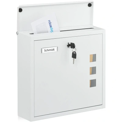AmazonModern: Letterbox made from premium iron with windows - White finish suits any house Nameplate: Your name is clearly displayed on the mailbox – no more postal mix-ups. Accessories: The wall-mounted mailbox includes mounting hardware and 4 keys – easy to install. Viewing windows: With 3 slots, you can quickly check if there’s any post for you in the letterbox. Details: Mailbox H x W x D: approx. 33 x 35 x 12 cm - Includes fittings, nameplate and sight windows