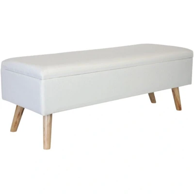 General description This stylish upholstered bench with a soft linen cover is a true highlight for your home. Whether used as a hallway bench, a sofa bench in the living room, or a bed bench in the bedroom, it enhances any space. The padded, foldable seat ensures comfort while concealing generous storage for laundry, blankets, or toys. Supported by four sturdy eucalyptus wood legs, this trunk bench combines stylish aesthetics with functional benefits. Technical specifications Overall dimensions H x W x D: approx. 40 x 110 x 40 cm Internal dimensions H x W x D: approx. 15 x 105 x 36 cm Ground clearance: approx. 19 cm Max. load capacity: 120 kg Weight: approx. 14.3 kg Material: MDF, eucalyptus wood, polyester Other information Various colours available Felt glides to protect the floor Delivery includes: 1x bench in parts, with assembly instructions and materials; decorative items are not included