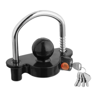 AmazonProtection: Protect car and horse trailers, caravans or trailers from theft with the trailer lock Basics: black caravan drawbar lock made of iron and aluminium - H x W x D: approx. 15 x 15.5 x 7.5 cm Use: lock for couplings with 5 cm diameter - insert ball head and fix with shackle Flexible: shackle of the coupling lock with 10 levels - suitable for standard tow bars Safe: drawbar lock for secure locking of the uncoupled trailer. Includes 5 keys