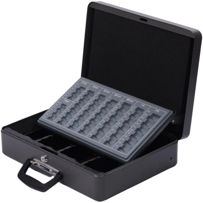 Amazon MarketplaceSecure: Lockable cash box in grey with a lock and 2 keys – safe cash storage Organised: Money box with removable insert featuring 4 slots – easily sort notes and coins Versatile: Cash box for cash - Ideal for clubs, flea markets, fairs and more Stable: Cash box made of sturdy iron with a matt finish – dimensions HxWxD: approx. 10 x 37 x 28 cm Versatile: Compact cash box with a carry handle – easy to transport and flexible for use