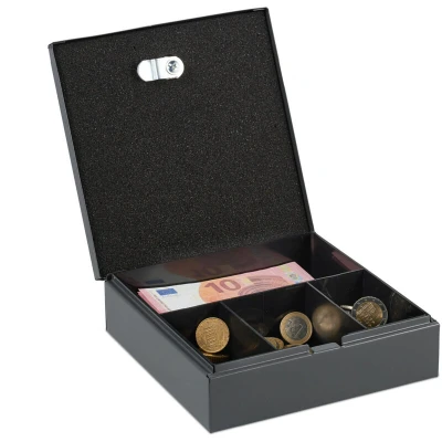 Amazon MarketplaceSecure: Lockable cash box with 2 keys - Safe cash storage, ideal for school trips or office cash tin Organised: Cash box with removable insert featuring 4 compartments - easily sort notes and coins Versatile: Cash box for money - Ideal for clubs, flea markets, fairs and more - In grey colour Sturdy: Cash box made of durable iron with a shiny finish - Size HxWxD: approx. 6 x 17 x 17.5 cm Versatile: Portable cash box suitable for transport - Can also be mounted on the wall or table