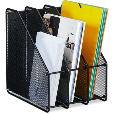 Relaxdays Magazine File, A4, 3 Compartments, Mesh Design, 31.5 x 24 29 cm, Office Tidy, Document Holder, Metal, Black, Steel