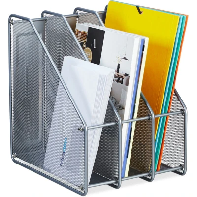 Relaxdays Magazine File, A4, 3 Compartments, Mesh Design, 31.5 x 24 29 cm, Office Tidy, Document Holder, Metal, Silver, Steel