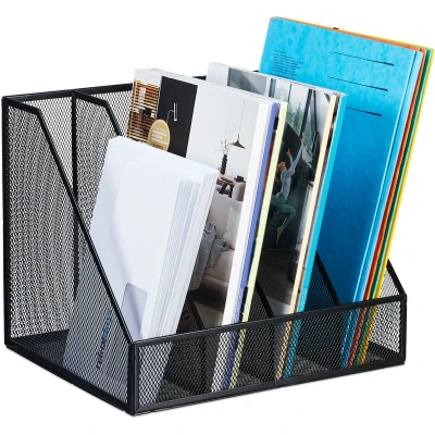 Relaxdays Magazine File, A4, 4 Compartments, Mesh Design, 26 x 31 cm, Office Storage, Document Holder, Metal, Black, Steel