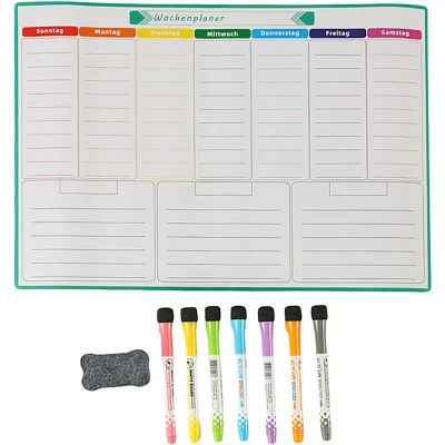 AmazonOrganised: German weekly planner for appointments and tasks – fridge calendar Magnetic: Flexible magnetic board in A3 format with a strong grip – securely adheres to the fridge Wipeable: Weekly planner with PET film is easy to clean - Reusable planner Complete: Fully equipped whiteboard planner with 7 colourful markers and 1 cleaning sponge Versatile magnetic calendar for cleaning, meal or study plans – ideal for daily organisation