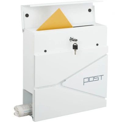 General description This letterbox with newspaper compartment blends in well with any façade thanks to its modern design. The matt metal postbox features a decorative pattern and "Post" lettering, making it an attractive addition to your house wall. It allows for easy posting of letters, postcards, and other mail through a wide letter slot with a protective flap, while the newspaper tube underneath enables simple removal of your Sunday newspaper. Technical specifications Overall dimensions (H x W x D): approx. 38 x 37 x 12 cm Weight: approx. 3.5 kg Material: iron Dimensions of newspaper tube opening (H x W): approx. 10 x 8.5 cm Dimensions of letter slot (W x D): approx. 29.5 x 2.5 cm Distance between mounting holes (horizontal): approx. 28.5 cm Distance between mounting holes (vertical): approx. 17.5 cm Included in Delivery 1x letterbox 4x keys Instructions and wall mounting materials Decorative items are not included Other information Concealed cylinder lock for securing mail against