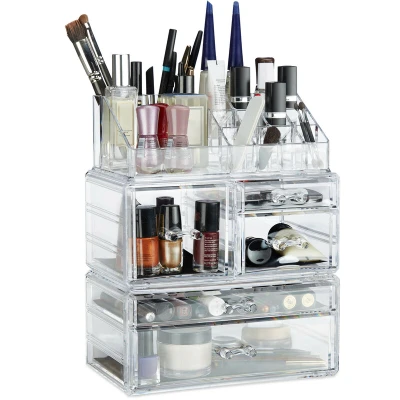 AmazonFor makeup: Small transparent makeup organizer for tidy storage of your cosmetics and jewellery - Set contains 3 boxes - H x W x D: app. 29.5 x 23.5 x 14 cm Drawers: 5 Drawers in various sizes - Each drawer is lined with black velvet - Keep your jewellery free from scratches and dirt Stackable: Use the cosmetic organiser set of 3 boxes either individually or stacked on top of one another - Non-slip underside for security Neat and tidy: Spacious drawer for creams and clocks - Smaller drawers for powder, eyeshadow or rings - Makeup stand with quivers for nail polish, lipstick etc. Practical: Cosmetic tower for storing your makeup and save space - Use the versatile organizer for your bathroom utensils or stationery - Great gift idea for each occasion