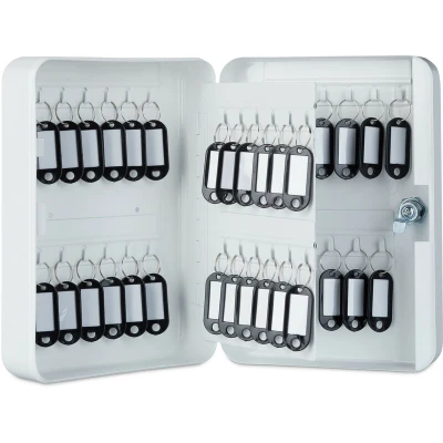 General description In this key box with 48 hooks, you can keep your keys safely stored in close reach at all times. Keep an overview by labeling the keys and hooks to ensure your family or co-workers don’t get confused. Made of robust iron for safety, this cabinet comes with all tools for wall-mounting included, making it a handy tool for offices, hotels, or workshops. Technical specifications Dimensions (H x W x D): 25 x 18 x 7.5 cm Weight: 1.3 kg Material: Iron Compatibility and accessories Lockable key garage with security lock Includes 2 keys for locking 48 key tags for organization 48 numbered stickers for labeling Mounting materials included