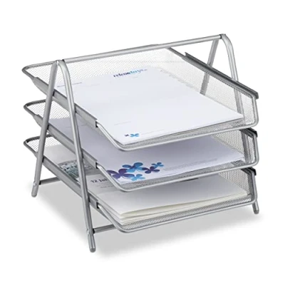 AmazonPractical accessories: document tray for letters, paper, etc. - 3 deep shelves for books and folders - Dimensions H x W x D: approx. 27 x 29.5 x 35.5 cm Made of metal: lightweight metal mesh for the desk - filing system in trendy mesh design - letter tray in silver 3 compartments: sorting station with 3 shelves for DIN A4 paper - compartments with a distance of approx. 6 cm from each other - compartment inner dimensions H x W x D: approx. 4 x 26 x 34 cm Easy to assemble: small file rack to assemble - With rails for easy insertion and removal of the compartments - Shelves with a wavy surface For the office and home: sorting tray for school supplies such as books and notebooks - desk tray for newspapers, magazines and mail - document holder for the office