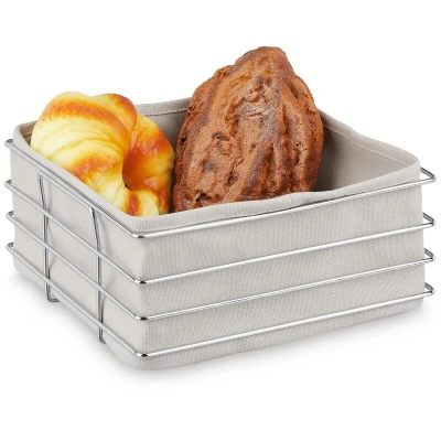 General description This modern bread basket is ideal for the breakfast table or your next afternoon tea. It is perfect for serving fresh bread, warm buns, and buttery croissants. The elegant combination of silver metal and monochrome lining is both practical and stylish. After you’re finished at the table, it’s easy to remove the lining and shake it out, allowing you to quickly get rid of any remaining crumbs. Technical specifications Total dimensions: approx. 23 x 23 x 10.5 cm (LxWxH) Inner dimensions: approx. 22.5 x 22.5 x 10 cm (LxWxH) Weight: approx. 480 g Material: Stainless steel, lining Other information Included in delivery: 1x breakfast basket, 1x lining Decorative items are not included