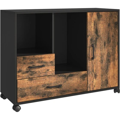 Effective work begins with a well-organised workplace. This versatile rolling container offers ample storage for files, equipment, and office supplies, featuring two differently sized drawers, two open compartments, and two adjustable shelves behind the door. The top shelf of the multi-purpose cabinet is ideal for printers or decorative items. Thanks to the four smooth-running castors, the office container can be easily moved and fits conveniently under the desk. Rolling Container in Detail - Dimensions H x W x D: approx. 70 x 90 x 35 cm - Material: wood-based material, iron, plastic - Colour: brown, black Practical Office Cabinet for Effective Working - Ideal for the office, study, or living area - Top shelf provides space for a printer, decorative items, or tech - Two drawers of different sizes and two open compartments for office supplies - Two adjustable shelves behind the door for files and larger items - Mobile with 360° castors, two featuring practical locking brakes