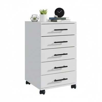 AmazonOrganisation: White filing cabinet for neat storage of documents in the office or study Storage space: Rolling cabinet with 5 drawers – ample room for various office supplies Mobile: Office cabinet with 4 360° swivel wheels for easy mobility – locking brakes for stability Versatile: the top shelf of the roll container offers space for a printer or coffee machine. Details: Mobile file cabinet made of durable wood - HxWxD: 69 x 40 x 40 cm - Load capacity: 75 kg