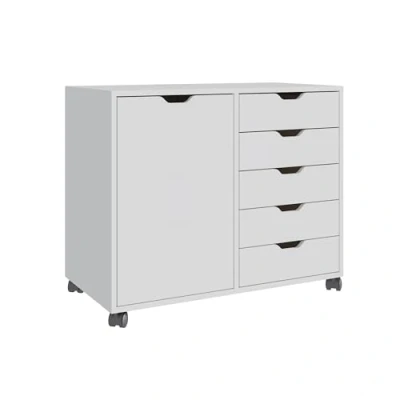 Order: White trolley for storing documents and office supplies in the office or study Storage: filing cabinet with 5 drawers and adjustable shelves for organized storage. Mobile: File cabinet with 4 rotating castors for easy movement – 2 with brakes Versatile: the top of the roll container accommodates a printer or coffee machine. Details: Modern side table made of sturdy wood with door – dimensions (HxWxD): approx. 65x78x40 cm