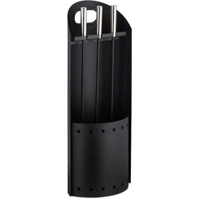 General description A crackling fireplace warms you up on cold and rainy days, when comfort and coziness are essential. With this 4-piece fire irons kit, you can successfully kindle your fire and ensure the pit always stays clean. Made of steel, this set is especially stable and durable, featuring stainless steel handles that add a modern and luxurious look. You can hang all tools from the rack for neat storage and easy access. Technical specifications Stand size: H x W x D: approx. 59 x 23.5 x 16 cm Poker length: approx. 54.5 cm Ash shovel length: approx. 55 cm Broom length: approx. 57 cm (bristles approx. 6 cm) Total weight: approx. 3.5 kg Material: Stainless steel, steel Colour: Black, silver Included in Delivery 1 x Fireplace Tool Rack 1 x Ash Broom 1 x Ash Shovel 1 x Poker Decorative items shown in product photos are not included