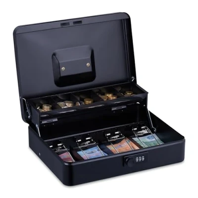 Secure: Practical cash box with individually adjustable 3-digit number combination - In black Organised: Cash box with 5 coin and 4 note compartments - notes and coins are easy to organise Versatile: Cash box for cash - For clubs, flea markets, fairs and other events Sturdy: metal cassette made of robust iron with powder coating - HxWxD: approx. 8.5 x 30.5 x 24.5 cm Portable: Handy cash box with practical carrying handle for easy transport - ideal for taking along