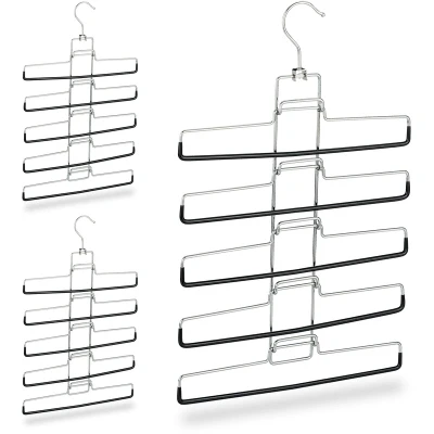 AmazonMultiple: Set of 3 multi hangers for 15 pants total - 5 Removable holders per piece Compact: Multi hanger for 5 skirts at once - Compact and crease-free storage Non-slip: Silver metal hanger with black PVC - Rubber-coated rails prevent slipping Practical: Individually removable coat hangers for pants, skirts etc. Robust: Solid metal pants holder with 8 kg capacity - H x W x D: app. 52 x 33.5 x 2 cm