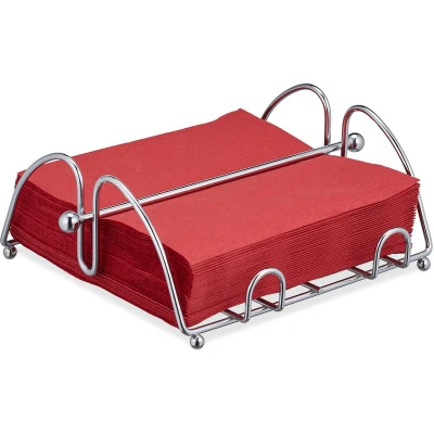 General description No longer fly-away napkins thanks to the practical napkin holder made of shiny metal. The elegant weighted bar ensures that napkins stay in place, making this dispenser fabulous for outdoor celebrations like barbeques, garden tea parties, and weddings. Not only suitable for home use, but also a decorative and useful table accessory in restaurants, bars, or cafés. Technical specifications Size (H x W x D): approx. 8 x 22.5 x 19.5 cm Inner size (H x W x D): approx. 2.5 x 18 x 18 cm Weight: approx. 200 g Material: Chrome-plated iron Colour: Silver Compatibility and accessories Designed for standard paper napkins up to 33 x 33 cm (1/4 Fold) Other information Included in Delivery: 1 x Napkin Holder (napkins not included) Decorative items shown are not included