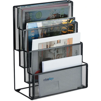This 4-shelf magazine stand is ideal for storing magazines, journals, brochures and leaflets in a neat and space-saving way. The magazine rack looks great in the living room or as a storage space for documents, letters and files in the office. The open mesh design in metal gives it a modern look. Felt glides on the base of the freestanding magazine stand protect the storage surface from scratches. Metal Magazine Rack Details - Overall dimensions H x W x D: approx. 43 x 33 x 18 cm - Load capacity: approx. 2.5 kg per level - Weight: approx. 1.3 kg - Material: Steel - Available in various colours Modern Document Storage - Internal dimensions first compartment H x W x D: approx. 12 x 32 x 4.5 cm - Internal dimensions of second compartment H x W x D: approx. 16 x 32 x 4 cm - Internal dimensions of third compartment H x W x D: approx. 19 x 32 x 3.5 cm - Internal dimensions of fourth compartment H x W x D: approx. 22 x 32 x 4 cm Paper Rack for Newspapers and Magazines - 4 spacious shelves at