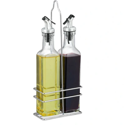 Relaxdays Oil and Vinegar Dispenser Set, 300 ml Glass Bottles, Metal Holder, Pourer, 27.5 x 11 6 cm, Transparent, 70% 20% Iron 10% Plastic