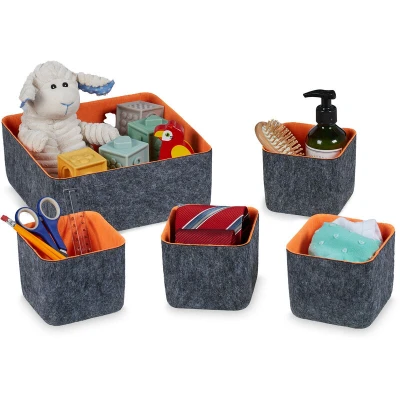 Relaxdays Organiser, 5 Piece Storage Baskets for Cabinet, Wardrobe, Drawer etc, Felt, 2 Sizes, Dark Grey/Orange, 10.5 x 25 cm