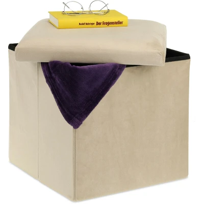 Relaxdays Ottoman, Stool with Storage, HWD 38 x cm, Foldable, Cushioned Velvet and MDF, Cream