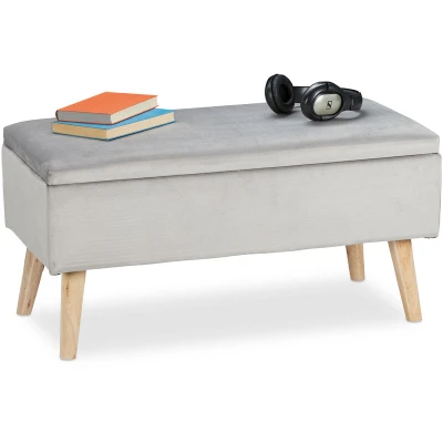 Relaxdays ottoman storage bench, velvet upholstery, 40 l capacity, padded, wooden legs, seating furniture, light grey, Wood, 80 x 41 cm